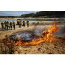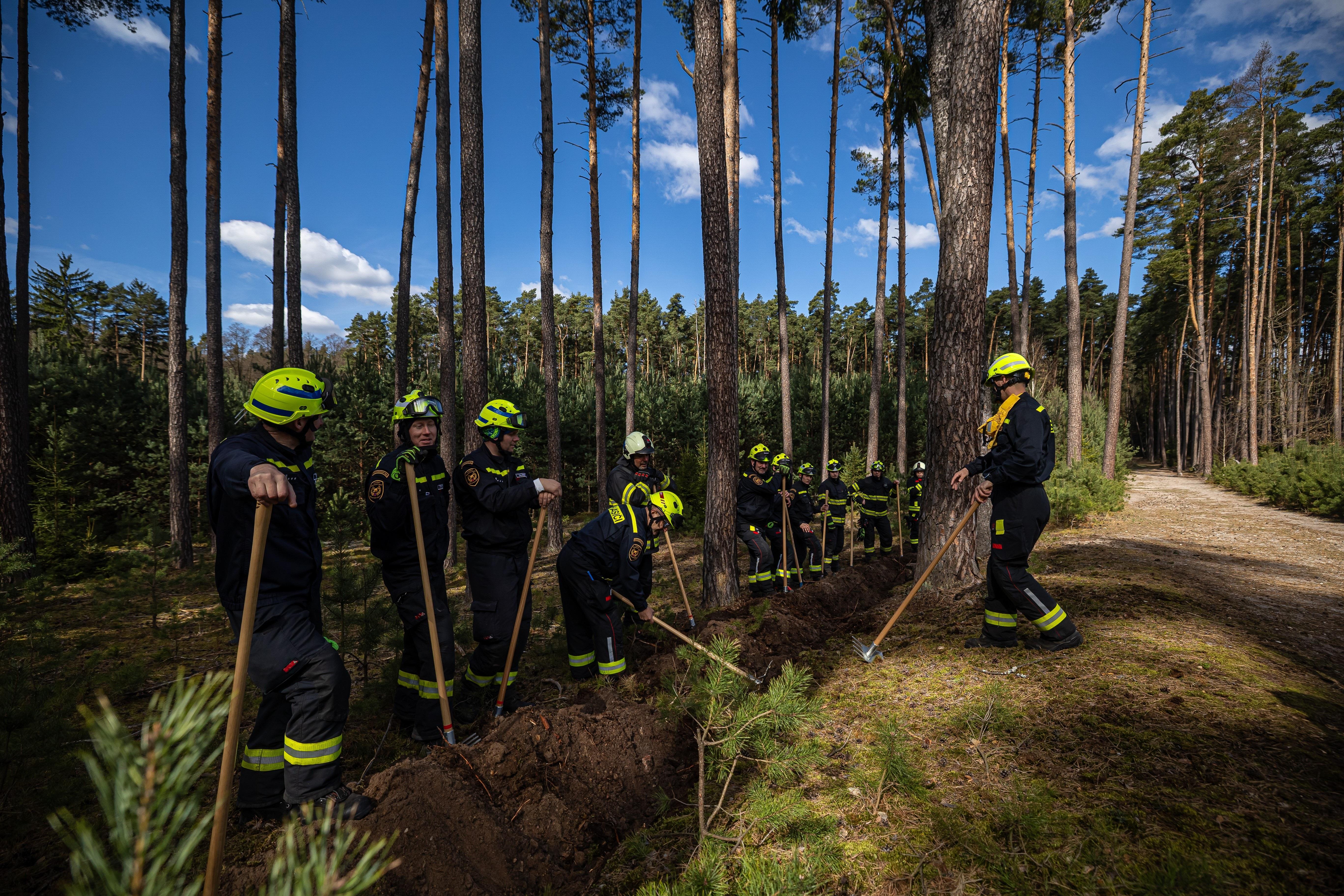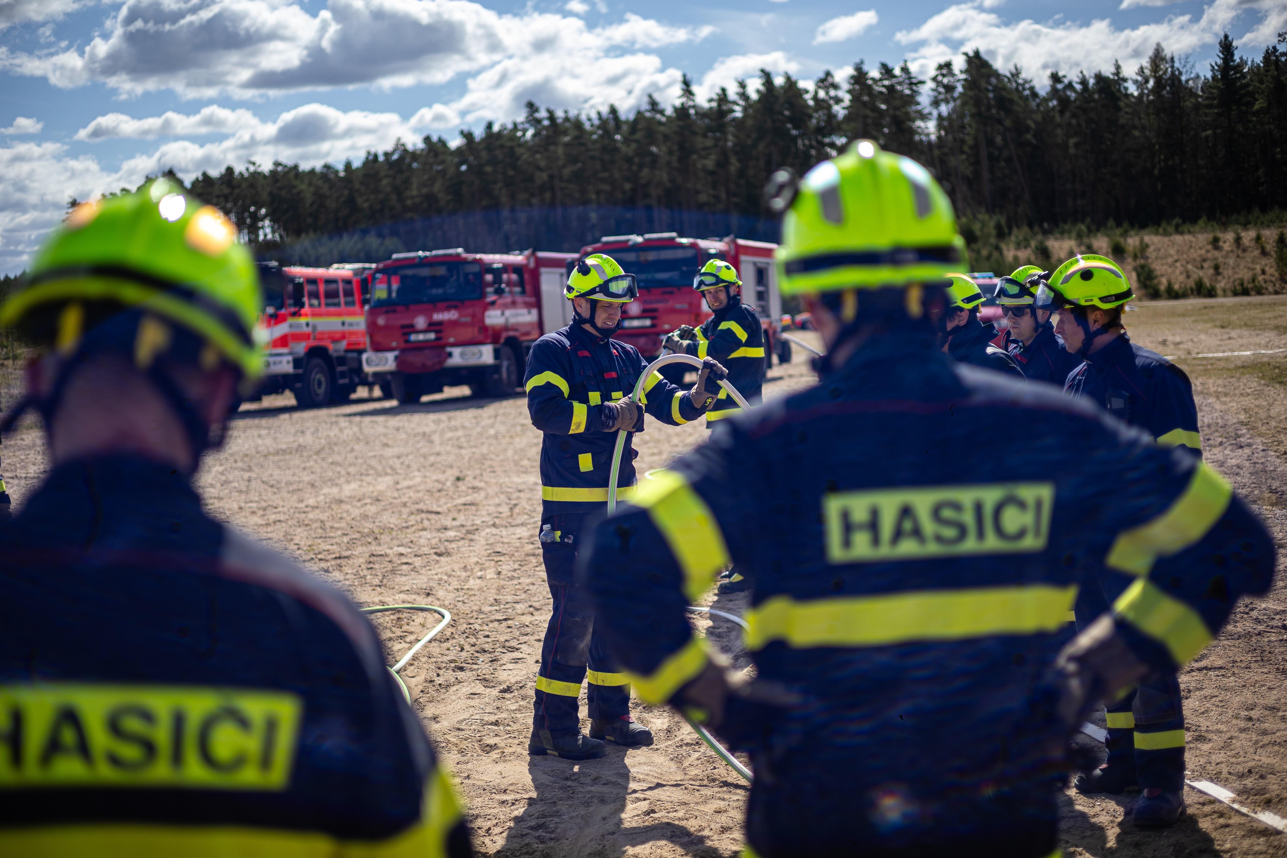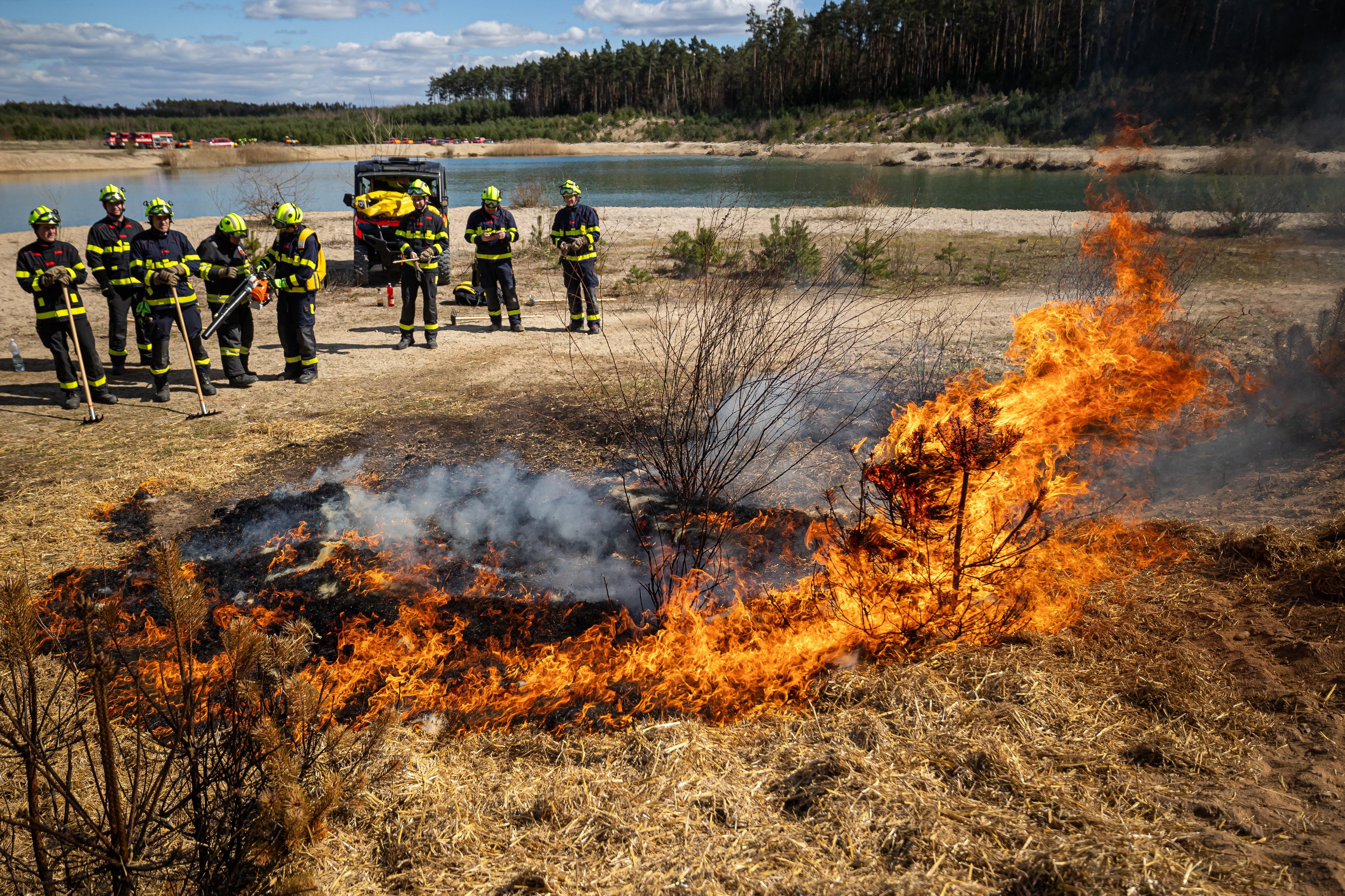 Hasiči z Královéhradeckého a Pardubického kraje spolu cvičí hašení lesních požárů.